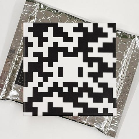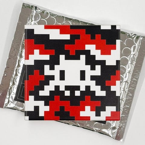 Denne keramiske flise blev skabt i 2024 af Invader i anledning af udstillingen Invader Space Station, som blev afholdt i Paris i de tidligere lokaler hos avisen Libération.