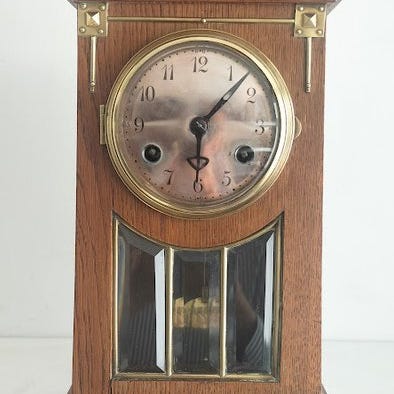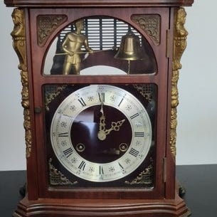 Junghans Art Deco bordurur ur bordklok, ca. 1970–1980, i træ og messing med mekanisk urværk og 1 dages gangreserve, 21 cm høj, 36 cm bred, 13,5 cm dyb, vægt 2629 g, med optræksnøgle og halvtimes slag på flere gongere, fremstillet i Tyskland og i fornuftig brugstilstand med glaslågen til uret manglende. Klik på den blå "gå til varen" knap, for at købe eller byde på denne vare. Den samlede pris vil blive vist inden du afgiver dit bud.