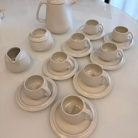 Sættet har et livligt flerfarvet blomsterprint, lavet med brede, teksturerede penselstrøg, der minder om Ginori Mondovì-skolen fra 1950'erne og 1960'erne, men med en mere moderne friskhed og endnu mere håndværksmæssig forarbejdning.