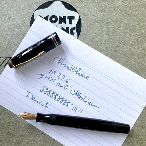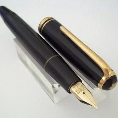 Montblanc Meisterstück krop i blank resin med gyldne detaljer, nib i 14K guld håndlavet, pennens længde med låg 14,5 cm, pennens længde 12,5 cm, omkreds 4 cm, i stand som ny og fungerer.