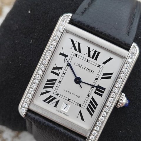 Cartier Tank Solo XL automatisk herreur med stålkasse på 31 mm, hvid skive, læderrem, år 2018, reference W5200028, god stand med synlige brugsspor og ommalet urskive, inklusive originalboks, dokumentation og garanti, rem lang. Klik på den blå "gå til varen" knap, for at købe eller byde på denne vare. Den samlede pris vil blive vist inden du afgiver dit bud.