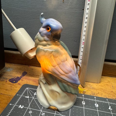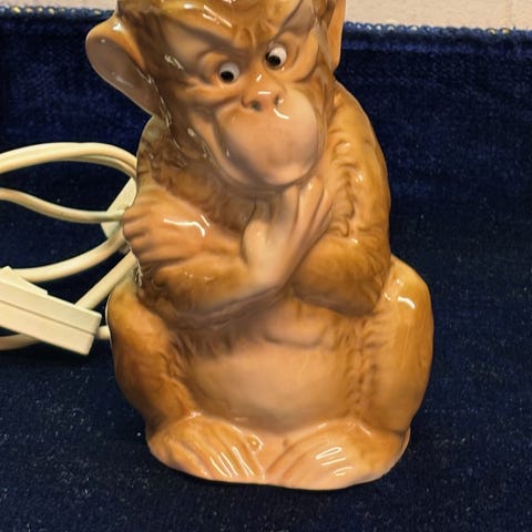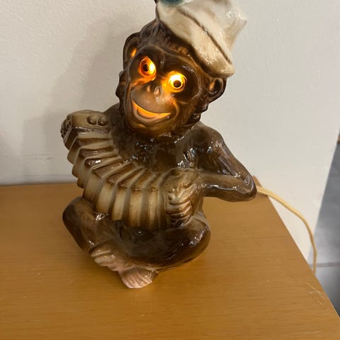 49 Rigtig fin ozonlampe af abe med pibe med fatning og pærer sælges for 275,00 kr. Den er 15 cm høj og 11 x 11 i diameter. Fremstår hel og fin uden afslag.