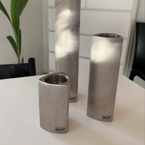 Fade samt Lysetager, Herstal Stål Fad 30 cm, Hvid Fad 40 cm, Farvet fad 35 cm, 7 armet lysestage samt 3 små Herstal Fyrfads stager, Sælges samlet