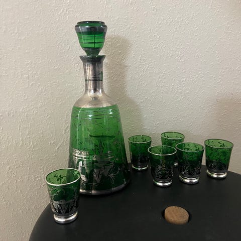 Vintage sæt bestående af fem drikkeglas samt karaffel af klart glas og massiv grøn bund.