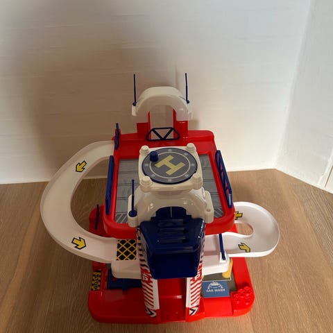 Fedt parkeringstårn, kan bruges til små racerbiler og vendes skinnerne, kan de store biler køre ned.