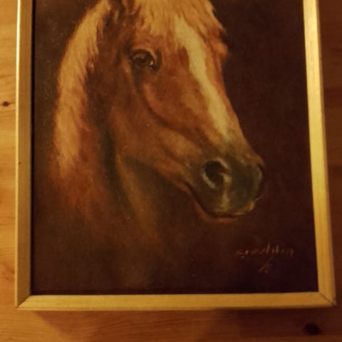 Maleri med hvid hest og føl