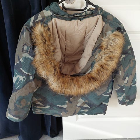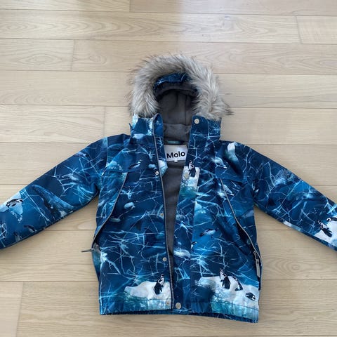 Molo børnejakke i størrelse 140 til drenge. Jakken er blå. Det er en vinterjakke. Den har hætte og lukkes med lynlås og knapper. Jakken er fra et ikke ryger hjem