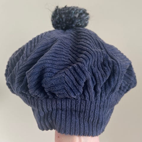 F style baret, også kendt som en baskerhue eller alpehue. Den er lavet af et blødt materiale 50% angora hvilket giver den et lodent udseende. Den har også en lille smule pynt på en side,dette kan ses på et af billeder.