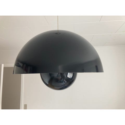 Verner Panton VP1 lampe i sort farve. Lampen har en rund form og er designet til ophæng. Materialet er metal i mat sort