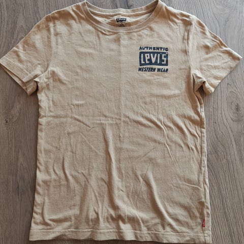 En grå T-shirt med kort ærmer og rundt halsudskæring. Der er et trykt logo midt foran med teksten 'Levi's'.