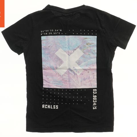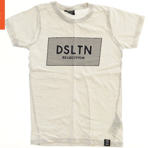 En kortærmet beige T-shirt med et sort kryds-tryk på forsiden og en større grafisk print på bagsiden, der indeholder et stort kryds, tekst og koordinater.