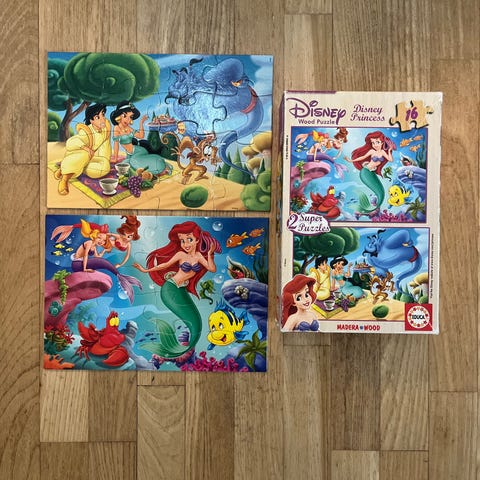 Disney Princess puslespil med motiv fra Cinderella. Boksen indeholder 50 brikker fremstillet af træ, og billederne viser klassiske scener fra Disney-filmen. Velegnet til børn i alderen 5-6 år. Puslespillet er produceret af Educa.