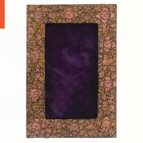 Dette er et botanisk billede, der viser en plante med lilla og lilla-rosa blomster. Billedet er indrammet i en dekorativ gylden ramme med detaljerede hjørner. Bagsiden af rammen er beklædt med tekstureret materiale og har en støtteklap, der gør det muligt at stille det på et bord. Den har også en krog til ophængning. Størrelsen er 24,5x18,5 cm.