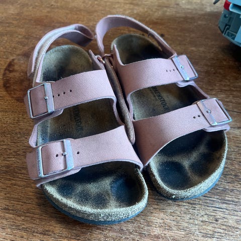 Denne sandal er sort og har en klassisk Birkenstock-stil med en justerbar rem. Den er lavet til at give komfort og støtte med en korksål. Sandalen er str. 34 og passer til børn eller personer med mindre fødder. Ideel til casual brug og sommeraktiviteter.
