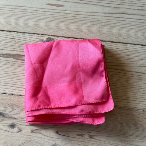 Tørklæde med paisley mønster i blå og hvid, måler 50x50 cm. Det er lavet af letvægtsmateriale og har en dekorativ kant.