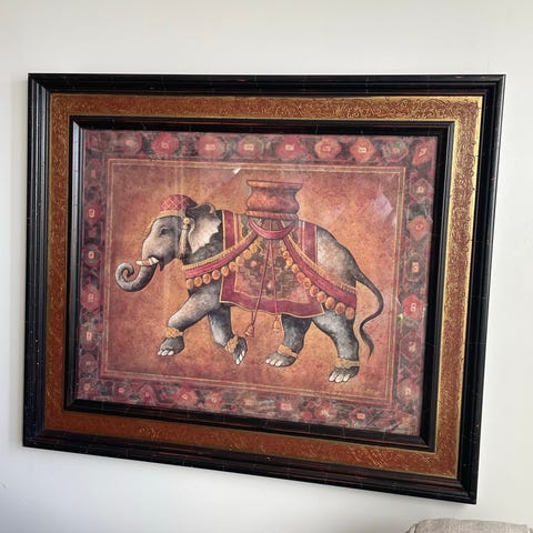 Dette er en billedramme med et kunsttryk kaldet 'Le Petit Safari'. Printet viser en fantasifuld safari-scene med dyr som zebra og giraf. Rammen har en cremefarvet kant og måler 56x46 cm. Bagsiden af rammen er lavet af en brun fiberplade med en wire til ophængning.