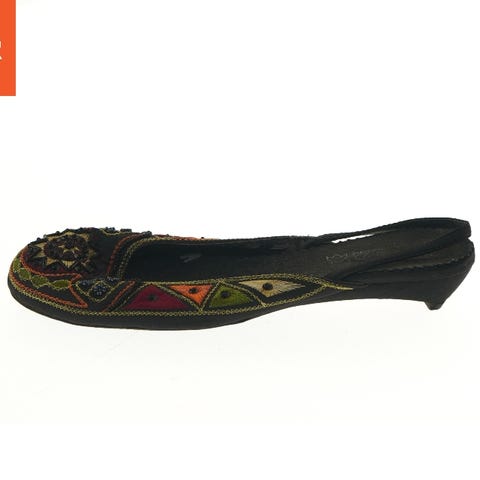 Disse unikke ballerinaer har en størrelse 39 og er dekoreret med et farverigt broderi. Skoene har en lille hæl og åbne bagremme, hvilket gør dem lette at tage af og på. De er prydet med geometriske og blomsteragtige mønstre i en blanding af grøn, orange, rød og gul på en sort base. Sålen er lavet af et gummimateriale. Der er tegn på brug på sålen og indersiden.