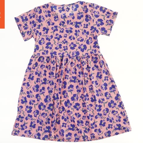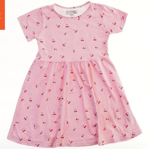 Dette er en lysegul kjole med korte ærmer og et fleret lag design. Den har en rund halsudskæring og er lavet af let materiale med diskrete striber i stoffet.