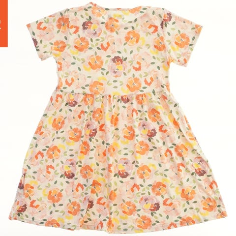 Kjolen har et farverigt blomsterprint i orange, blå og grønne nuancer. Designet inkluderer korte ærmer og en rund halsudskæring. Den har en underskørt med rynkedetaljer som giver et fyldigt look.