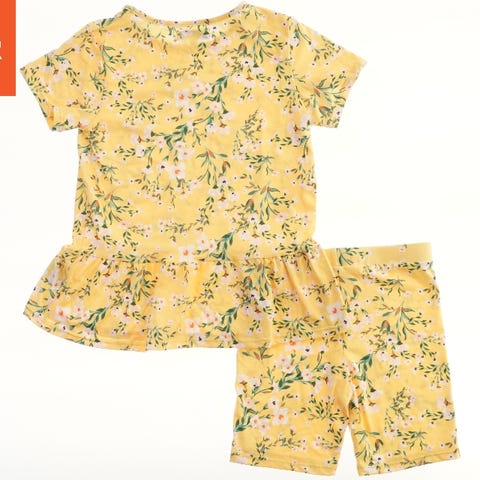 Sættet består af en kortærmet bluse og shorts. Begge dele har et blomsterprint med orange, gule og rosafarvede blomster samt grønne blade på en lys baggrund. Blusen har en rund halsudskæring og en flæsekant nederst.
