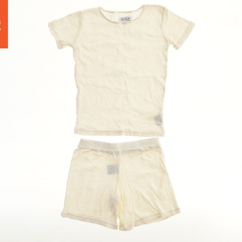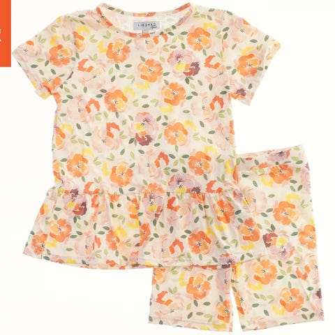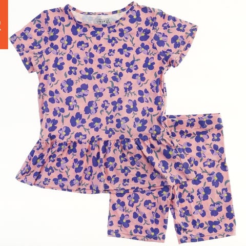Et lyserødt sommersæt bestående af en kortærmet bluse og shorts. Begge dele har et kirsebærmotiv spredt over stoffet. Blusen har en rund halsudskæring og en nederdel-lignende flæse forneden, mens shortsene har elastik i taljen.