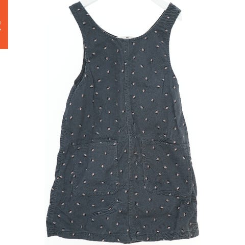 En mørkeblå børnekjole med et mønster af lyserøde, blå og hvide hjerter. Kjolen er uden ærmer og har en rund halsudskæring. Den har en elastisk talje og en let, bred nederdel.