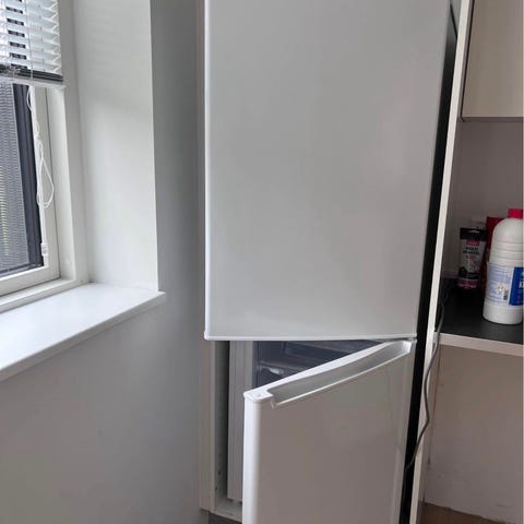 Logik køle-fryseskab med køle- og fryseafdeling. Hvidt design med flere hylder og opbevaringsrum i døren. Egnet til opbevaring af madvarer ved kølige temperaturer.