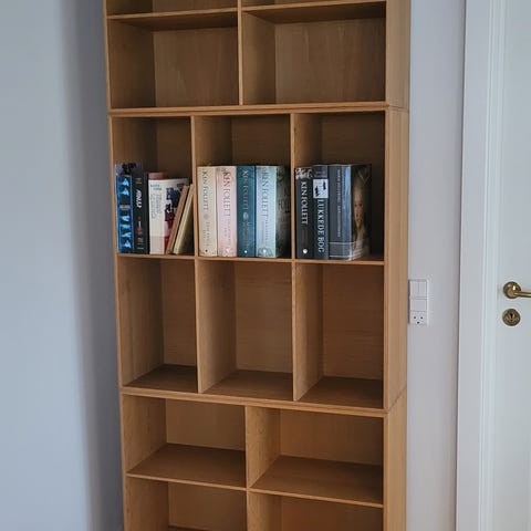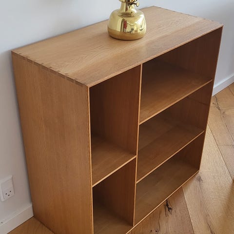 6-delt Mogens Koch reol i egetræ. Kan også bruges som væghængte bogkasser. Prisen er 5000,-