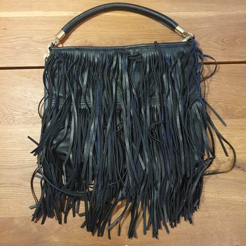 H&M Taske med frynser. Indvendig er tasken foret med lyserødt stof og lukkes med lynlås.