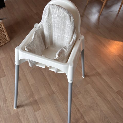 IKEA højstol til børn med hvid bakke og grå ben. Designet til at give en sikker siddeplads til små børn under måltider.