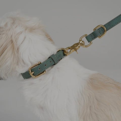 Lækkert hundehalsbånd og tilhørende hundesnor i brunt kernelæder og med messingspænder sælges.
