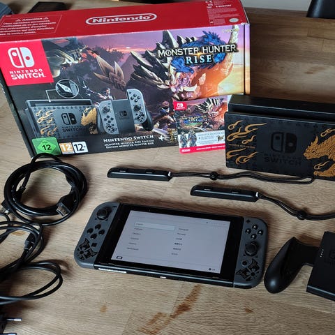 Nintendo Switch konsoltilbehør inklusive 5 spil og en ekstra controller.