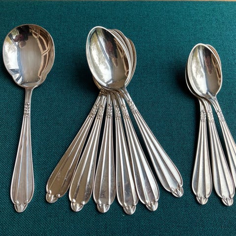 Krone pålægsgafler og kagegafler i sølvplet. Længde 13-14 cm. Trænger til at blive pudset.