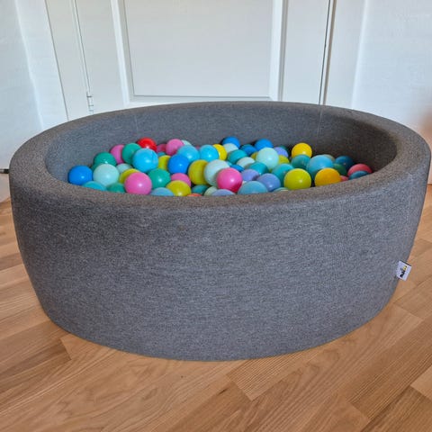 Stort kvadratisk boldbassin fra miso, 120*120 cm, med mindst 300 bolde. Det har tykke skumsider, der er ca 40 cm høje. Nypris 1200 kr.