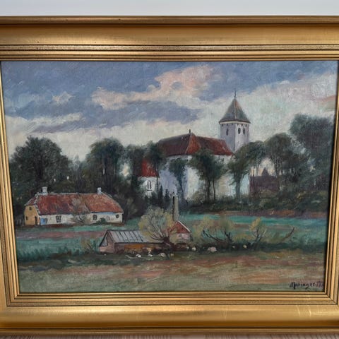 Oliemaleri af Køge kirke i kirkestrædet. Billedet måler 30 x 35 cm.