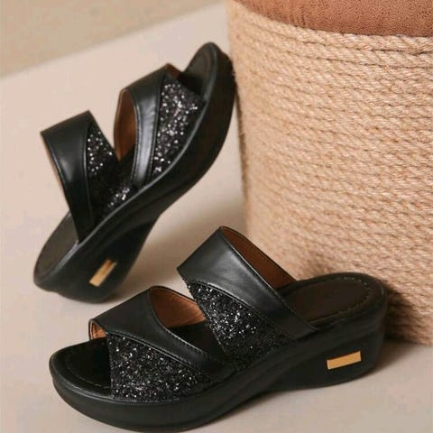 Et par sorte sandaler i størrelse 37. Sandalerne har en rem ved anklen med en spænde og er dekoreret med blomstermotiver på forfoden. Sålene viser tegn på brug. Disse sandaler er ideelle til hverdagsbrug om sommeren.