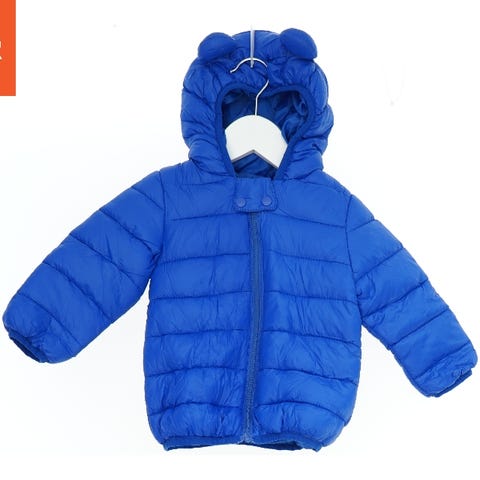 En børne vinterjakke med hætte. Jakken er todelt med en overdel i grøn farve og en underdel i blå. Den har elastiske manchetter og lommer foran. Inderforingen ser ud til at være af gråt stof.