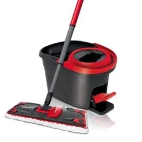 Vileda moppe med tilhørende mikrofiberklude. Moppen har et rødt skaft og 3 udskiftelige klude, inkl. ubrugte klude, i mikrofiber, designet til rengøring af gulve.