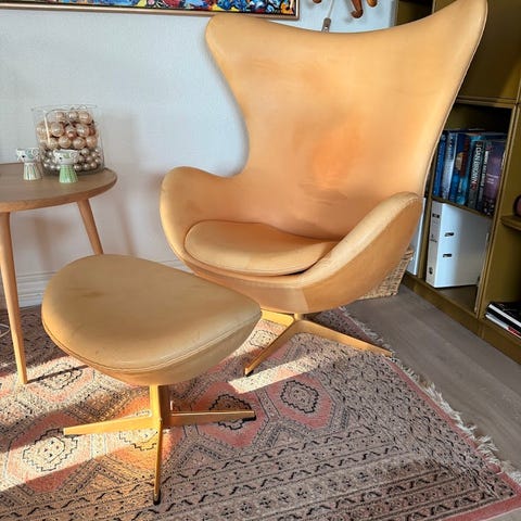 Arne Jacobsen Ægget jubilæumsmodel ‘Choise’ i blå canvas/elegance med brun læderkant, ben bruneret, stolene er med returdrej.