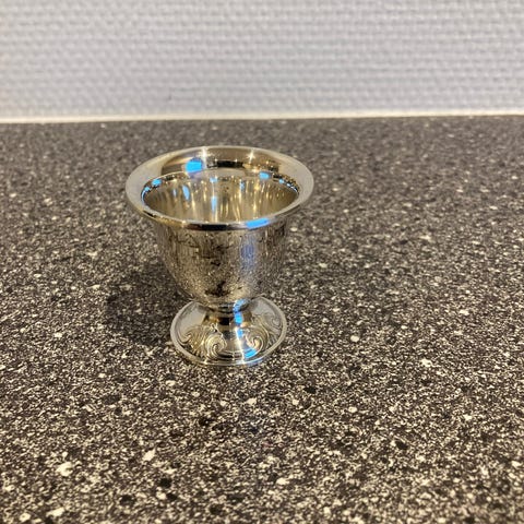 Sølv æggebæger lavet i 3 tårnet sølv. Det måler 4 cm. i højde . Har inskription på siden Ole 31.8 1947 , Fremstår i fin stand