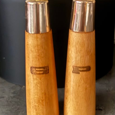 Dette er et retro / vintage sæt bestående af en salt- og en peberbøsse, begge lavet af teak træ. De har en konisk form og måler 7,5 cm i højden. Saltbøssen har en lys trætop, mens peberbøssen har en sort top, hvilket gør dem nemme at skelne fra hinanden. Bunden af begge bøtter viser tegn på tidligere mærkningsetiketter.