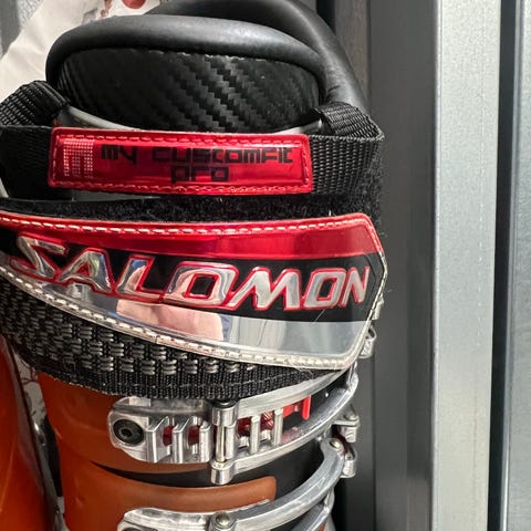 Salomon alpinstøvler i fin metallic lilla. Brugt, men fungerer. Se billede mht. størrelse. Jeg bruger str. 38.
