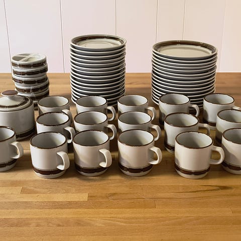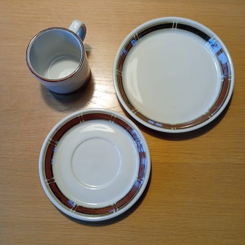 Seks kopper og undertallerkener samt fem kagetallerkener i stentøj. Fremstår i perfekt stand- helt som nye.
