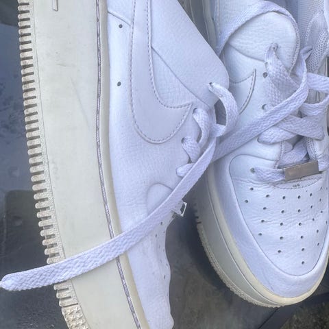 Et par hvide Nike sneakers i størrelse 38. Skoene har snørebånd og er lavet af læder med en perforeret overdel for åndbarhed. De har en flad sål med et cirkulært mønster for bedre greb. 'NIKE' er præget på hælen samt på ydersålen. Der er tegn på brug med lette pletter og slidmærker, især på sålen og hælen.