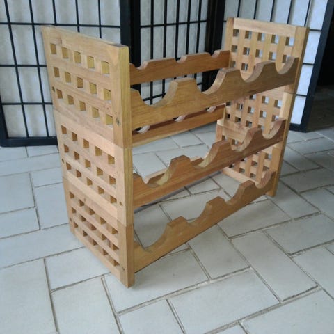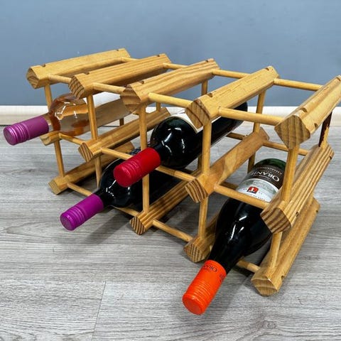 vinreol i træ til opbevaring af vinflasker. Designet til at holde flere flasker sikkert og organiseret. Fremstillet i træ