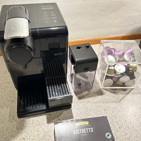 De'Longhi espressomaskine og kaffekværn. Maskinen har et kompakt design med sort og rustfrit stål finish. Den er egnet til brygning af espresso og har tilhørende tilbehør til tampering og dosering af kaffe.
