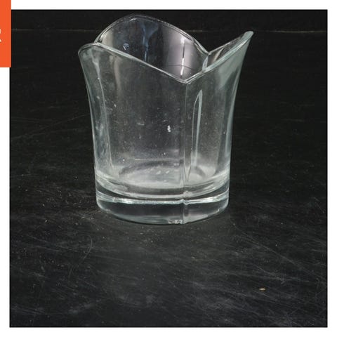 Glas vase på 12x13 cm med indgraveret tekst og blomsterdekorationer. Den er lavet af klart glas og kan bruges til dekoration eller som en lille blomsterpotte. Der ses ingen tydelige mærker eller skader på overfladen.