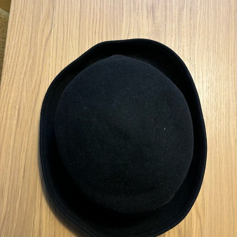 Herrehat i sort med et bånd rundt om hatten. Hatten har en buet kant og en let indsnævring øverst på kalotten. Materialet ser ud til at være en form for vævet tekstil.