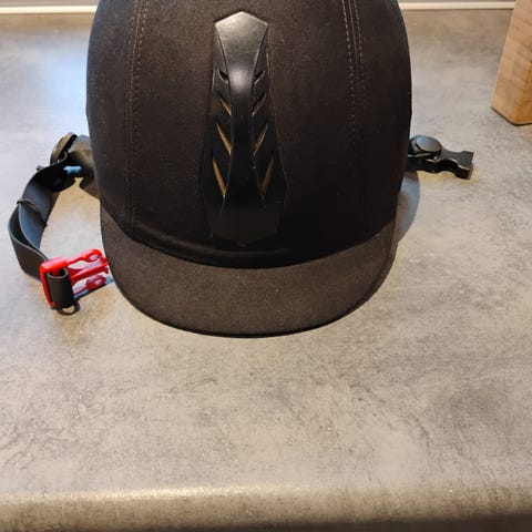En traditionel sort ridehjelm med justerbare stropper og ventilation i toppen. Indvendigt er hjelmen foret med en polstret lilla stofbeklædning, som sikrer øget komfort ved brug. Størrelsen og den specifikke model er ikke angivet, men det ses, at hjelmen er mærket med en producentetiket.
