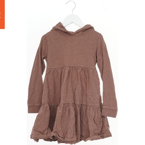 Denne kjole er brun og har en løs pasform. Den har korte, puffede ærmer og en rund halsudskæring. Kjolen er delt op i sektioner med rynkede sømme, der skaber volumen i nederdelen.